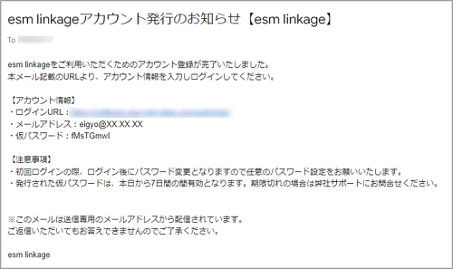 - esm linkageへのアカウント情報は、esm linkageをご契約時にソフトブレーンからご担当者様へお送りしましたメールをご確認ください。