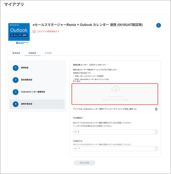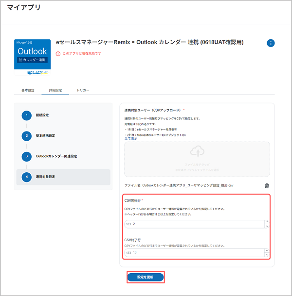 8. [CSV開始行]と任意で[CSV終了行]を選択後、[設定を更新]ボタンをクリックします。