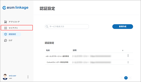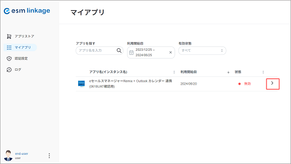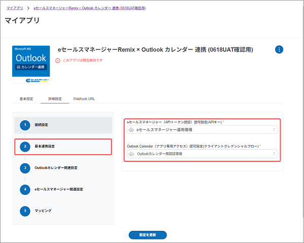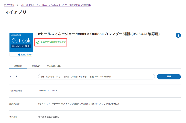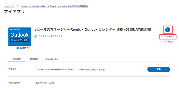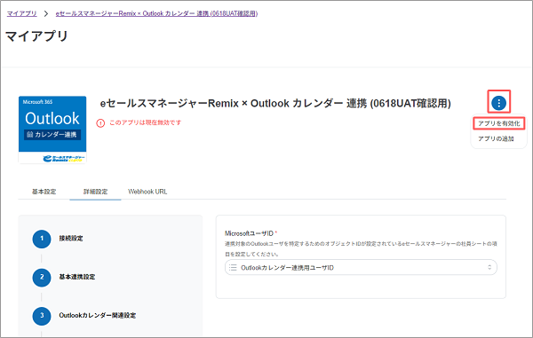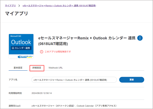 - Outlook連携アプリの連携を停止したい場合は、メニューより[マイアプリ]を選択後、対象のアプリ名をクリックして[詳細設定]タブの