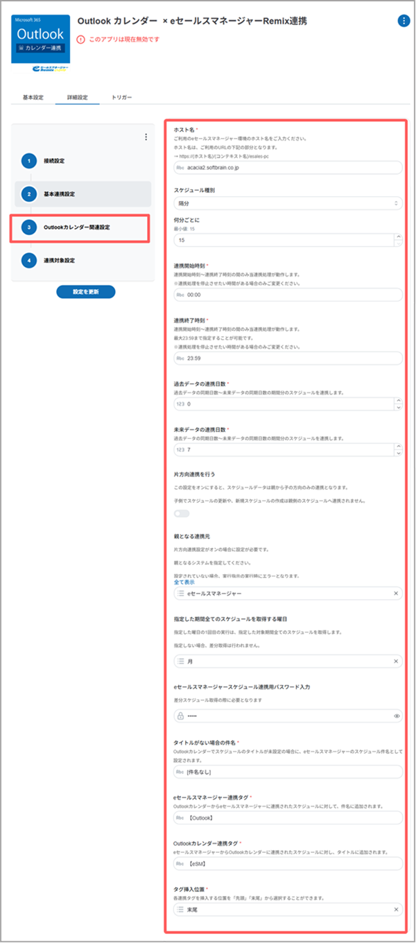 対象の曜日は非営業日を設定することを推奨します。 - [eセールスマネージャースケジュール連携用パスワード入力]には、事前に発行した連携アプリ用のパスワードを設定します。