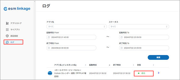 エラーの有無は、esm linkageの左メニューより[ログ]を選択し、連携期間を設定後に[検索]ボタンをクリックしてログから確認を行います。
