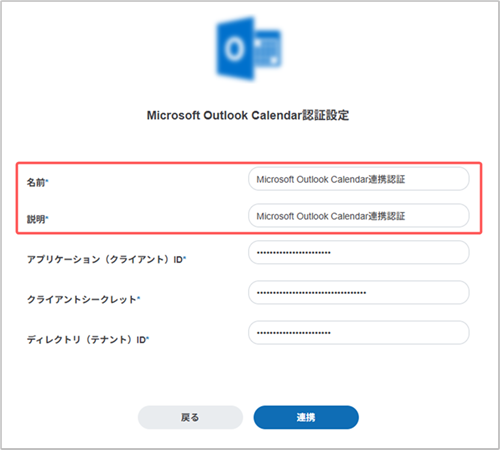 [Microsoft Outlook Calendar(アプリ専用アクセス)認証設定]画面が表示されます。