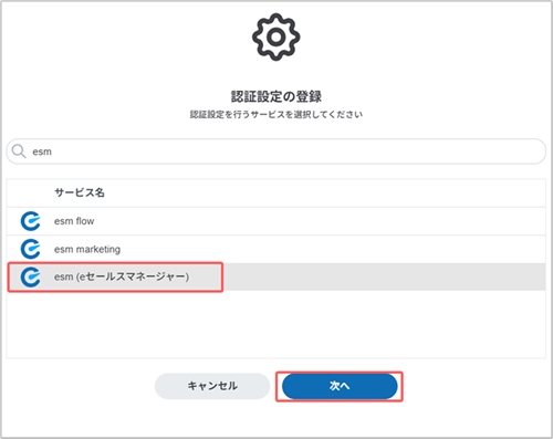 4. [esm (eセールスマネージャー)]を選択し、[次へ]ボタンをクリックします。