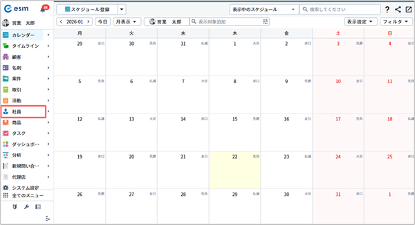 1. esm (eセールスマネージャー)へログインし「社員」を選択してください。