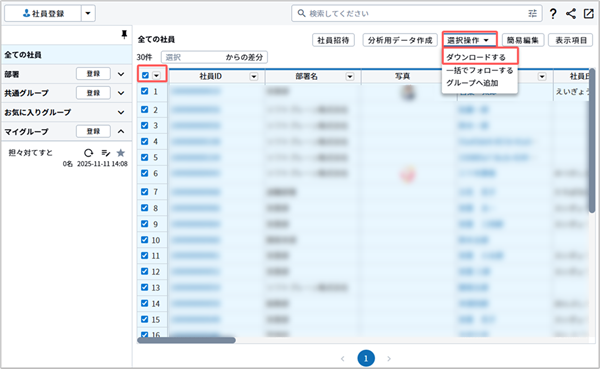 - 社員IDを表示項目として設定した状態でダウンロードを行ってください。