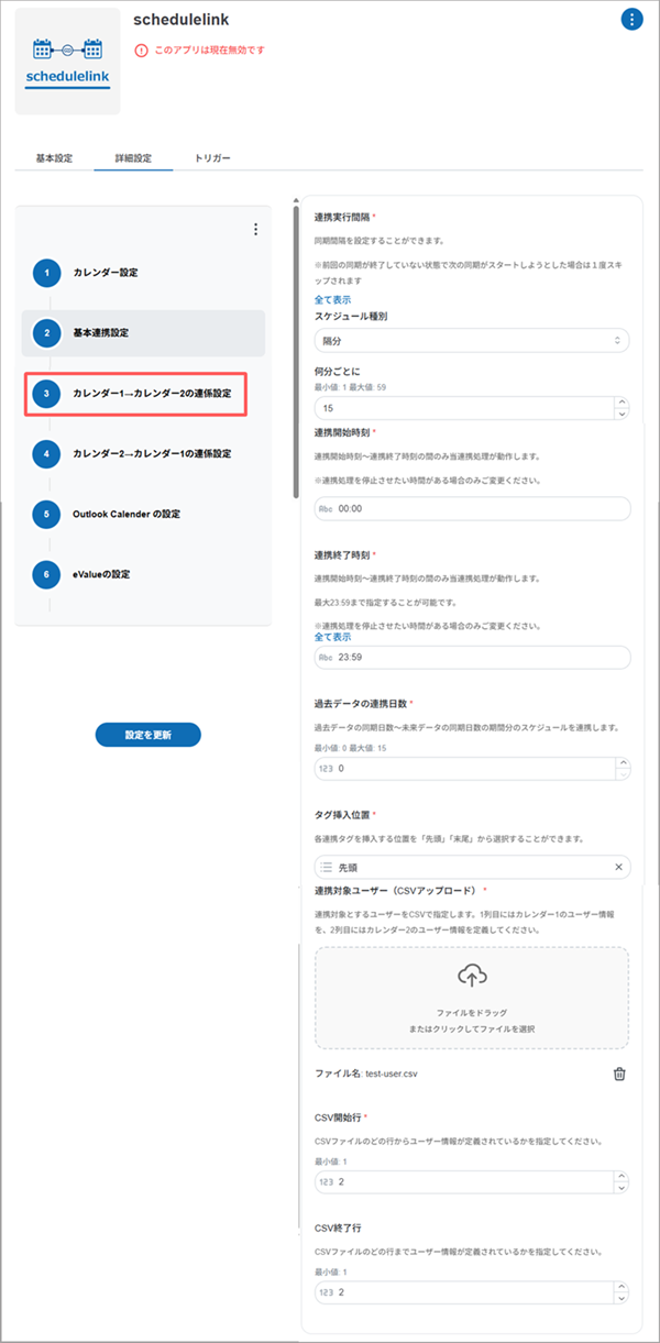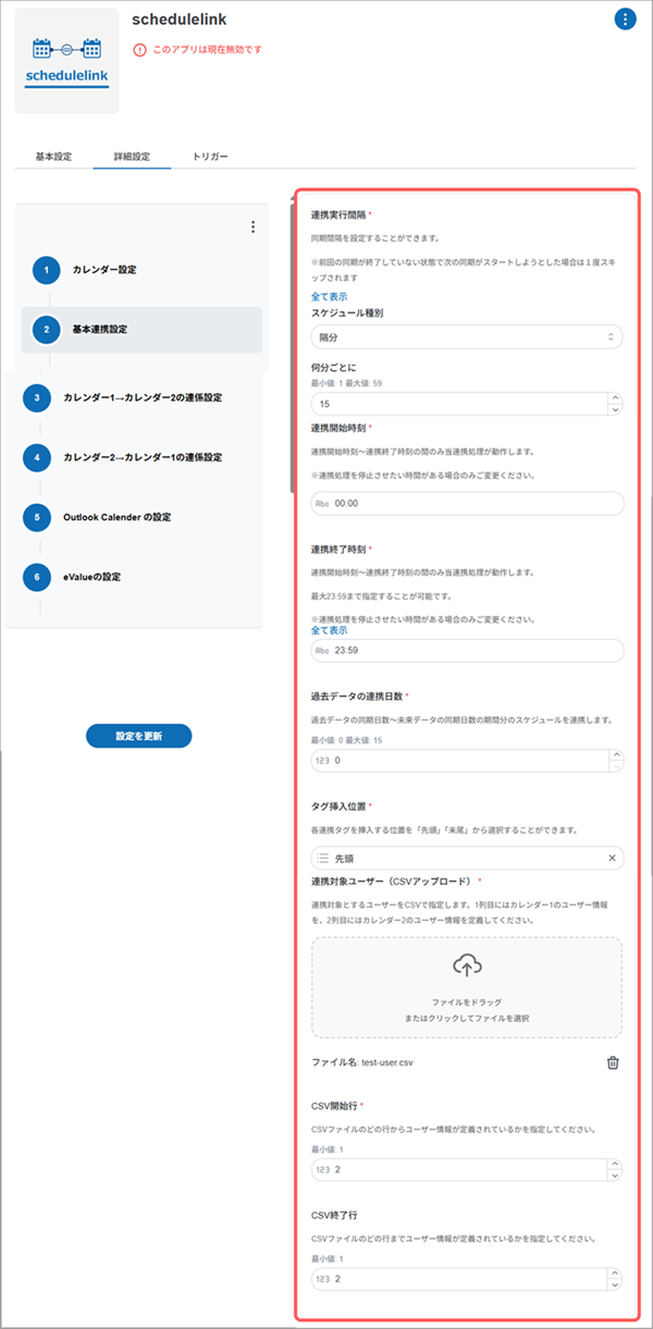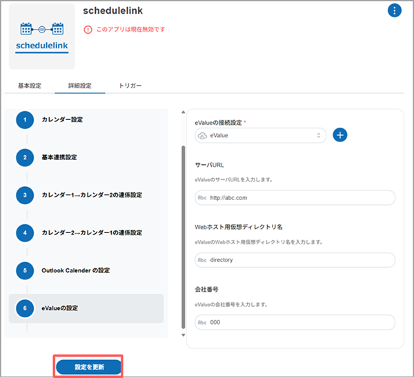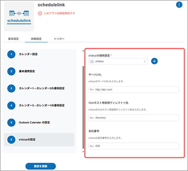 schedulelinkのアプリ設定の手順4「カレンダー1」もしくは「カレンダー2」にeValueを選択した場合、[eValueの設定]画面の各項目を設定します。