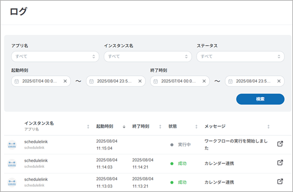 をクリックして[アプリを有効化]を選択してください。 - schedulelinkアプリが正しく動作しているかを確認したい場合は、メニューより[ログ]を選択して、対象のアプリの[状態]欄が「成功」になっているか確認します。