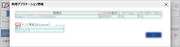 より[バージョン情報]を選択し、[利用アプリケーション]ボタンをクリックした際に、環境名の冒頭( )に記載されている値になります。
