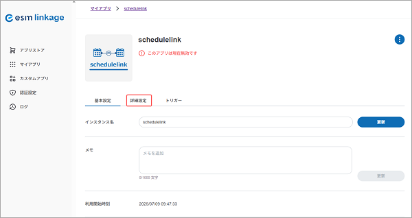 - schedulelinkのアプリ連携を停止したい場合は、メニューより[マイアプリ]を選択後、対象のアプリ名をクリックして[詳細設定]タブの