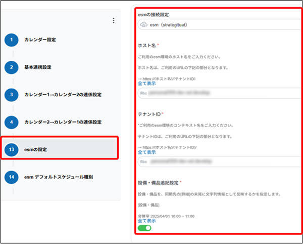 schedulelinkのアプリ設定の手順4「カレンダー1」もしくは「カレンダー2」にesmを選択した場合、[esmの設定]及び[esmデフォルトスケジュール種別]画面の各項目を設定します。