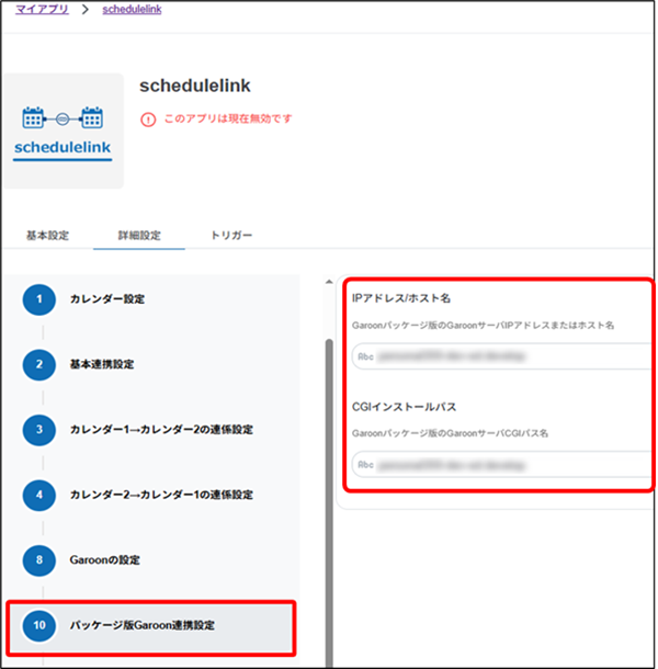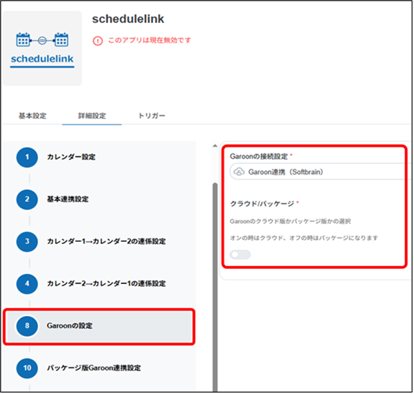 schedulelinkのアプリ設定の手順4「カレンダー1」もしくは「カレンダー2」にGaroonを選択した場合、[Garoonの設定]画面、[パッケージ版Garoon連携設定]・[クラウド版Garoon連携設定]画面の各項目を設定します。