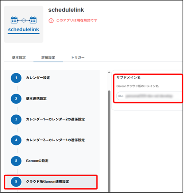 | サブドメイン名 | GaroonのURLのサブドメイン名部分を入力します。 (例)GaroonのURLがhttps://XXXXX/loginの場合 XXXXXを入力します。 |