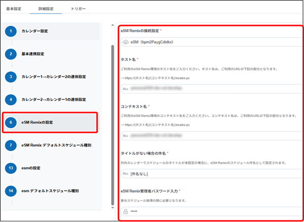 | eSM Remix管理者パスワード入力 | 事前に発行した連携アプリ用のパスワードを設定します。 スケジュール連携用パスワードの設定 |