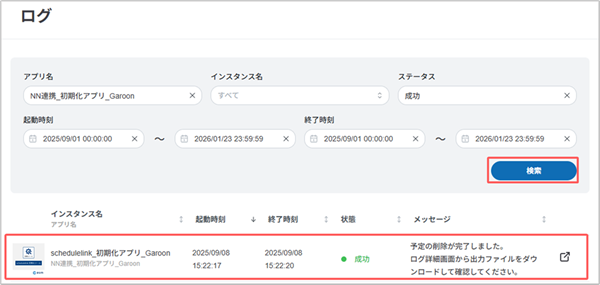 12. [検索]をクリックし、検索結果から予定の取得完了ログを選択します。