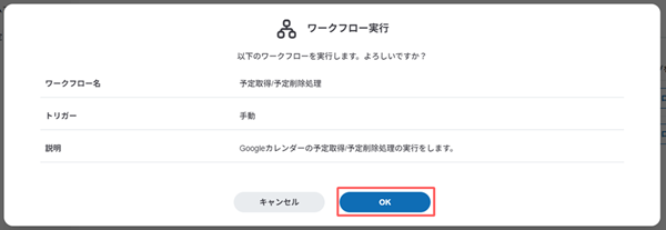 削除対象となる各スケジュールの社員、件名、時間が記載されているため、手動で登録したスケジュールが混ざっていないかを確認して下さい。