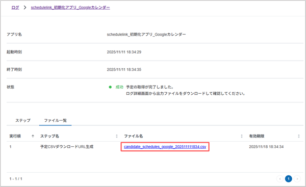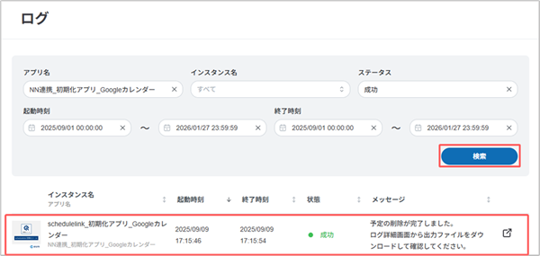 12. [検索]をクリックし、検索結果から予定の取得完了ログを選択します。