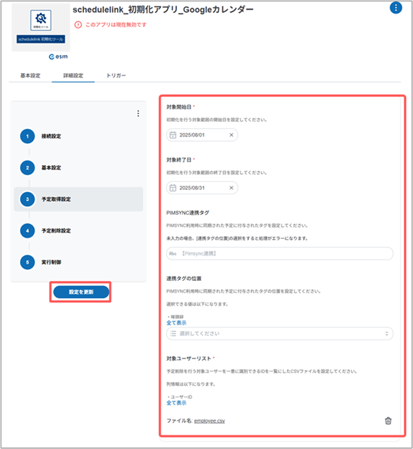 5. 各項目を入力し、[予定取得設定]をクリックします。