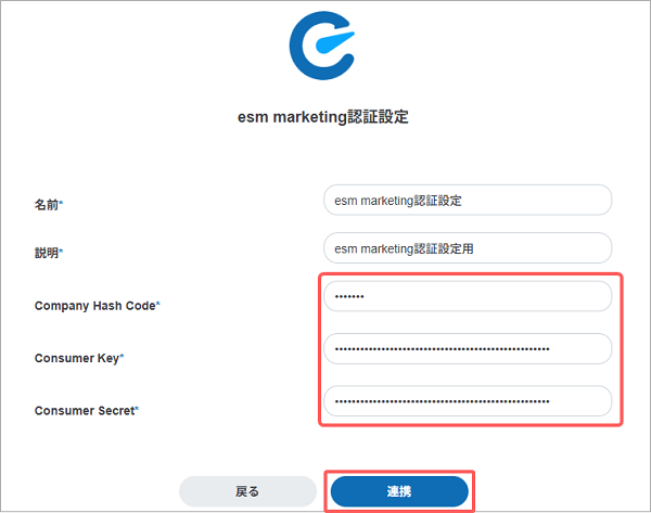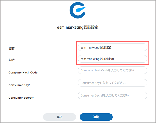 | Consumer Secrete | esm marketingを契約時に通知したメールに記載されているConsumer Secreteを入力します。 |