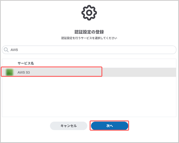 4. [AWS S3]を選択し、[次へ]ボタンをクリックします。