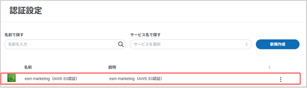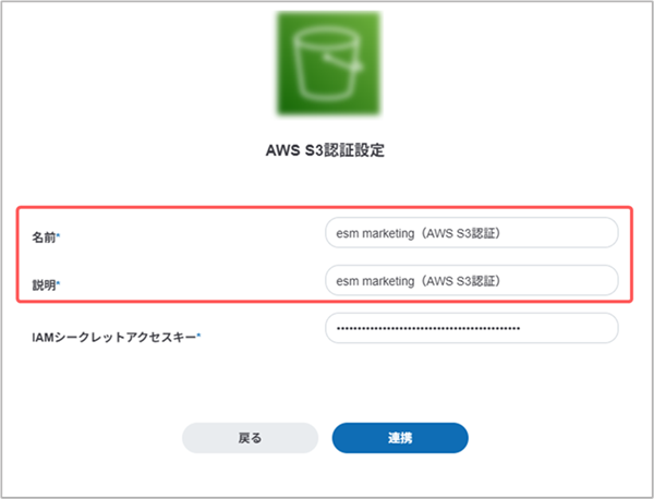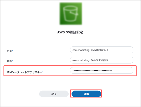 | IAMシークレットアクセスキー | esm marketingを契約時に通知したメールに記載されているIAMシークレットアクセスキーを入力します。 |