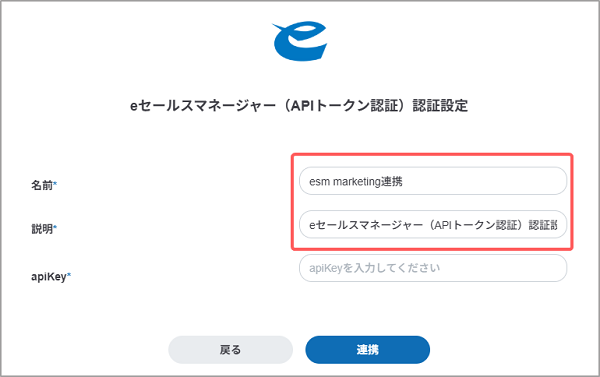 6. [apiKey]に、eセールスマネージャーで発行したAPIトークンを入力して[連携]ボタンをクリックします。
