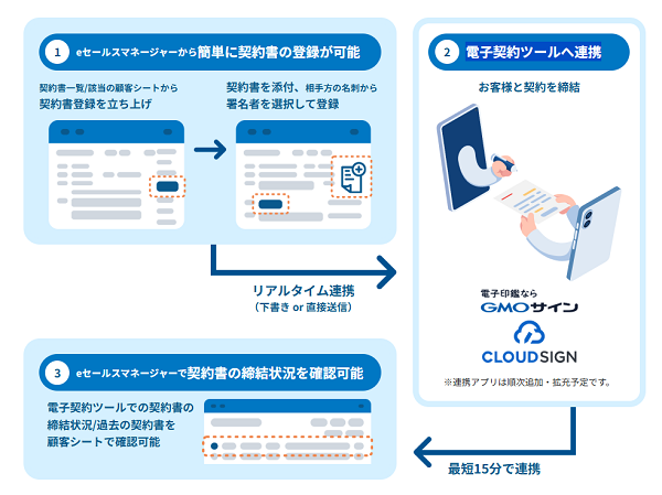 クラウドサイン連携アプリでは、eセールスマネージャーと「クラウドサイン」の連携が可能です。