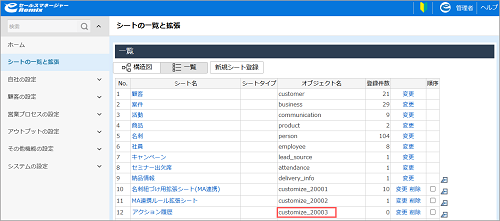 - オブジェクト名は、管理者画面の[シートの一覧と拡張]の「オブジェクト名」より確認が可能です。 画面の見かた(シートの一覧と拡張_管理者)