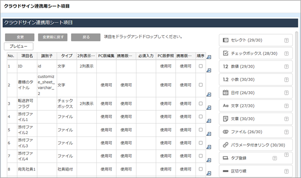 (例)クラウドサイン連携用シート - 任意の文字型項目を設定することでクラウドサインの任意項目と連携できます。