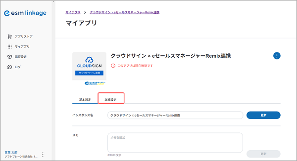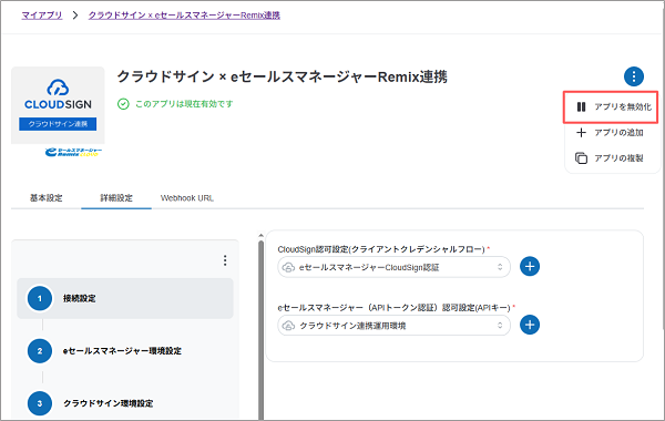 - クラウドサイン連携アプリの連携を停止したい場合は、メニューより[マイアプリ]を選択後、対象のアプリ名をクリックして[詳細設定]タブの