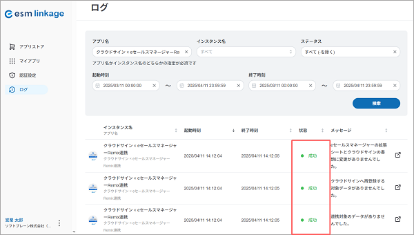 をクリックして[アプリを有効化]を選択してください。 - クラウドサイン連携アプリが正しく動作しているかを確認したい場合は、メニューより[ログ]を選択して、対象のアプリの[状態]欄が「成功」になっているか確認します。