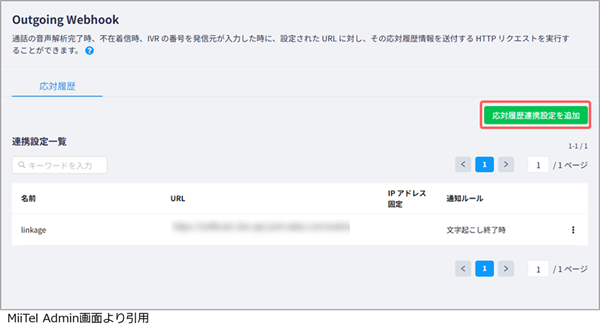 | URL | esm linkageの「eセールスマネージャーRemix × MiiTel連携」で取得した「WebhookURL」の値を入力します。 WebhookURLの取得 |