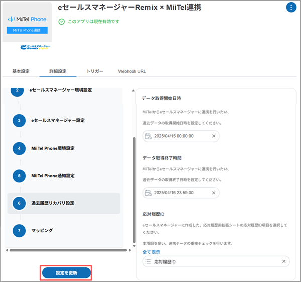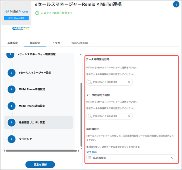 MiiTel Phone連携用アプリで、eセールスマネージャーの拡張シートに反映する応対履歴の期間を設定します。