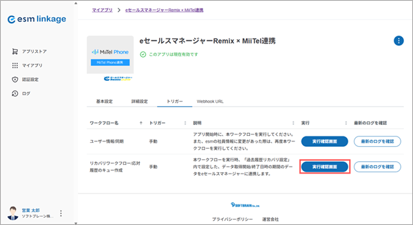 - [実行確認画面]ボタンはアプリが「有効」の状態でないと選択できません。