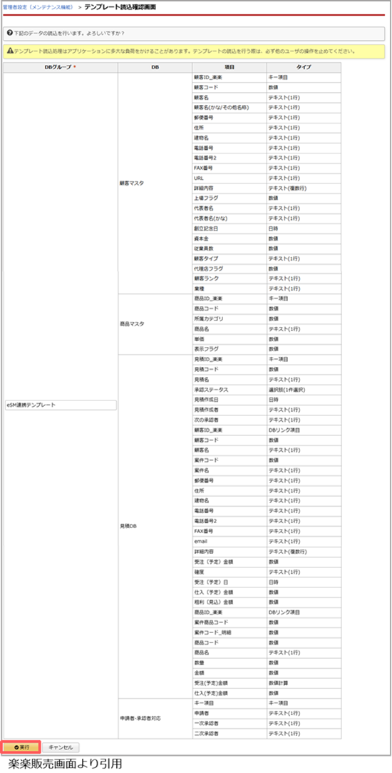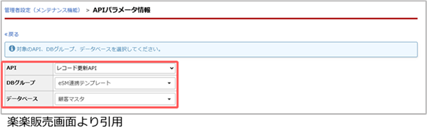 | DBグループ | 楽楽販売の[管理者設定]画面の[テンプレート読込み]画面で作成した「eSM連携テンプレート」を選択します。 すでに運用中の楽楽販売データベースを利用される場合は、対象のデータベースを選択します。 |