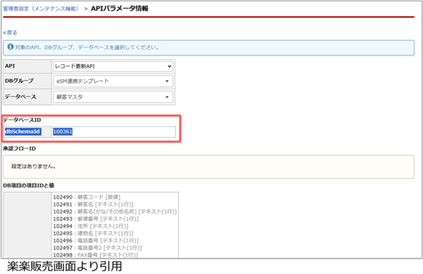 楽楽販売連携アプリ設定時に必要となる「データベースID」を確認し、「項目マスタ」を作成します。