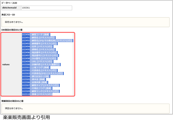 6. [DB項目の項目IDと値]の[values]もしくは[details]に表示されている文字列をすべてコピーして、メモ帳などのテキストエディタに貼ります。