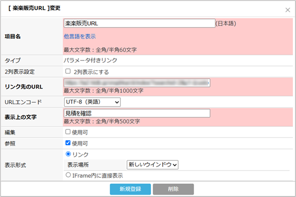 パラメータ付きリンク型項目(楽楽販売URL)の追加