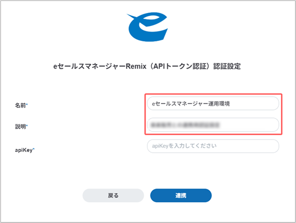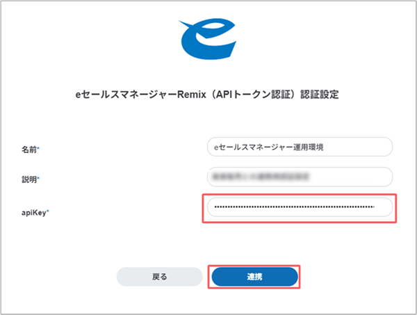 6. [apiKey]に、eセールスマネージャーで発行したAPIトークンを入力して[連携]ボタンをクリックします。
