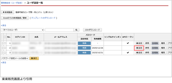 4. 連携対象のデータベースに対してアクセス可能なユーザーの[設定]ボタンをクリックします。
