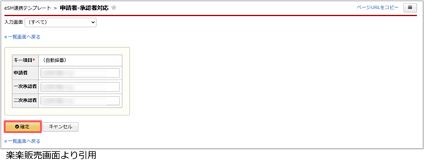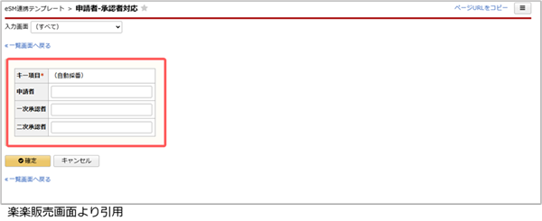4. [申請者][一次承認者]に、楽楽販売に登録されているユーザの「氏名」を入力します。