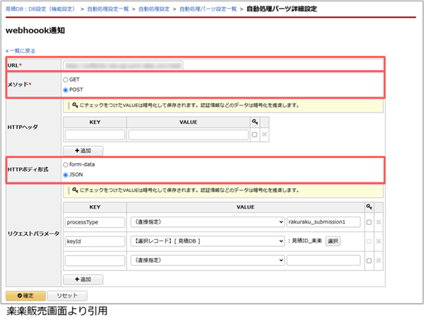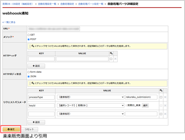 | HTTPボディ形式 | 「JSON」を選択します。 |