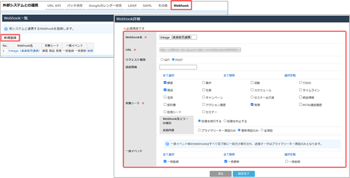 管理者画面の[Webhook一覧]画面で、楽楽販売連携用のWebhookを登録します。