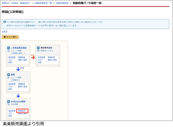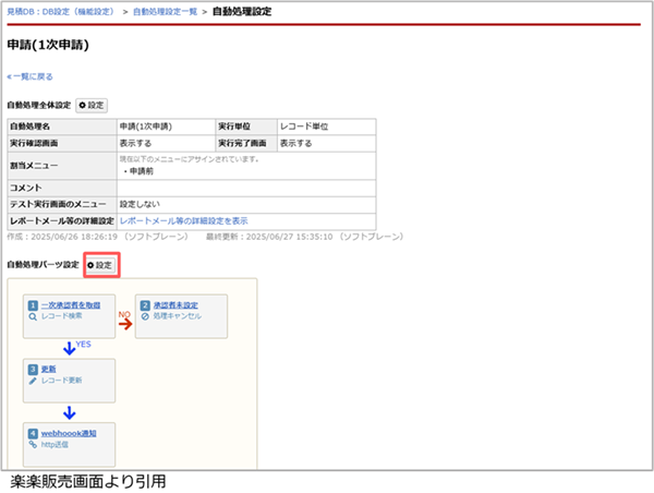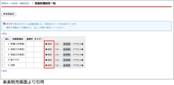 (例)[自動処理設定一覧]に「申請(1次申請)」「承認(1次承認)」「承認(2次承認)」「取り下げ」「否認」と表示されている場合
