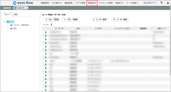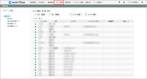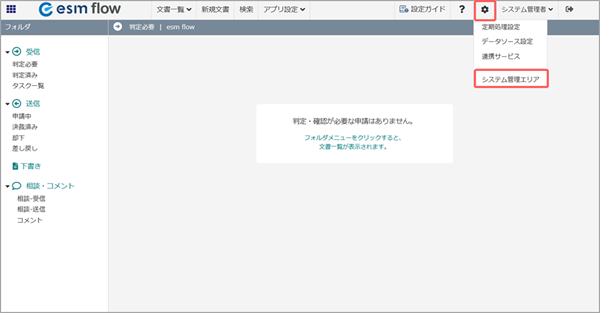 1. [システム管理者フラグ]がONに設定されているユーザーで、esm flowにログインします。