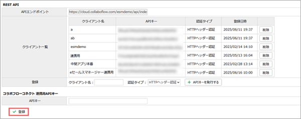 4. REST APIの[登録]で、[クライアント名]と[認証タイプ]を設定します。