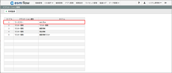 4. [アプリケーション種別]が「ワークフロー」に設定されている行のコードを確認し、メモ帳などで控えておきます。