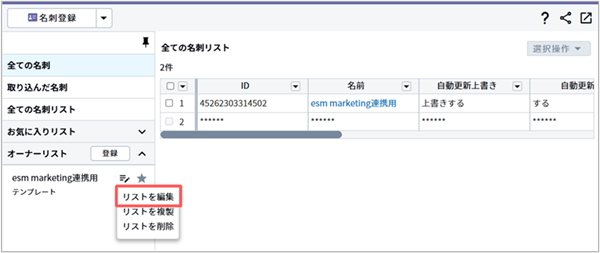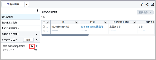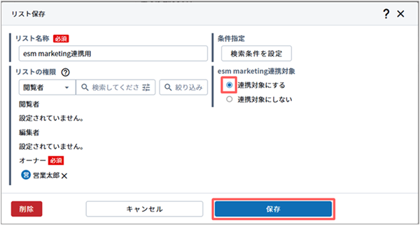 esm(eセールスマネージャー)の名刺リスト内の名刺情報を、esm marketingのカスタマーに自動で登録することが可能です。
