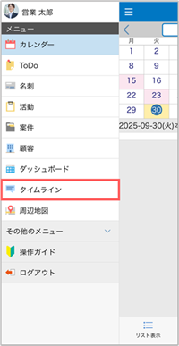 1. スライドメニューの[タイムライン]をタップします。