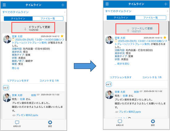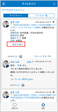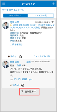 - [タイムライン]画面を開いた時点では「更新順」または「投稿順」で表示されています。