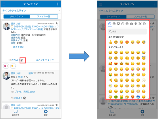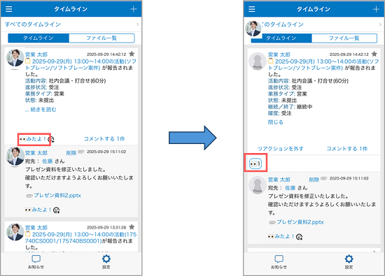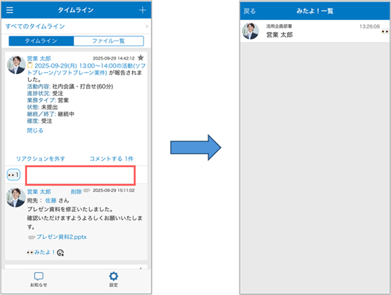 他スタンプを利用する場合は、事前に管理者より「タイムラインリアクション」を有効にする必要があります。 詳細は、以下の操作マニュアルを参照してください。 タイムラインリアクション設定 - [みたよ!]や他スタンプ右横の空白をタップすると、[みたよ!一覧]画面が表示され、[みたよ!]や他スタンプでリアクションした人を一覧で確認できます。